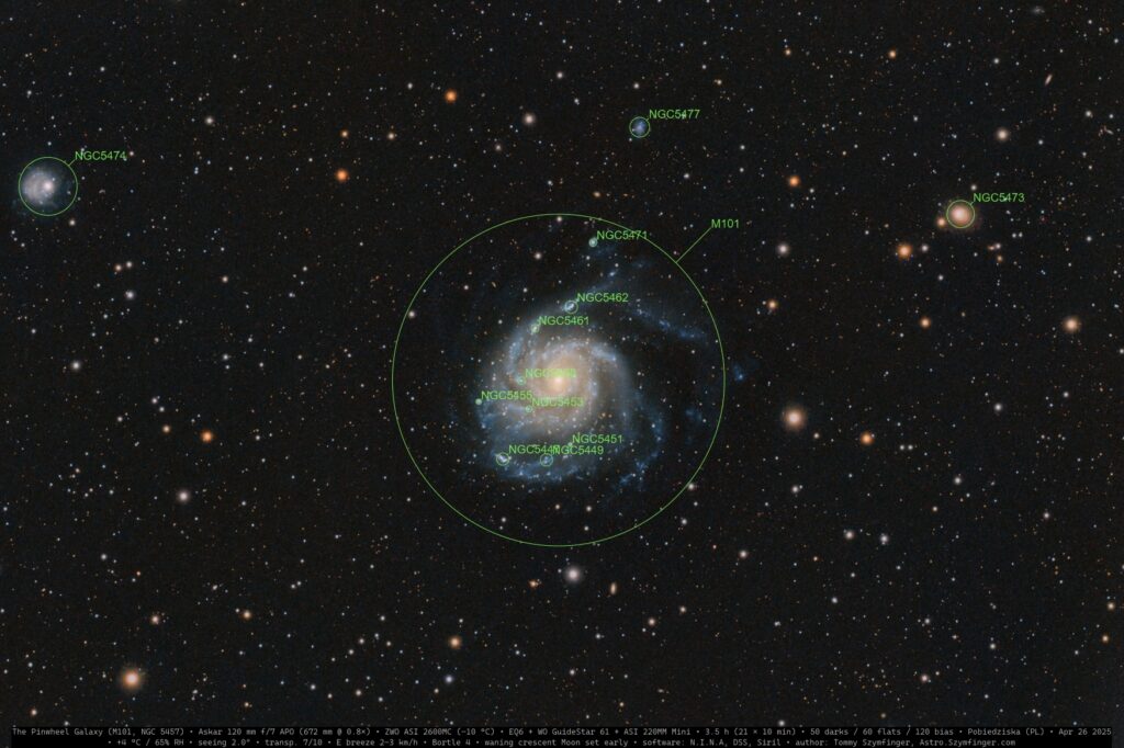 This image was taken from my backyard observatory in Poland on April 26, 2025, during one of the first truly spring-like nights of the season. After sunset, the temperature gradually dropped to +4°C, with relative humidity around 65%. Seeing conditions measured about 2.0 arcseconds, while transparency was 7/10 — slightly reduced by a thin veil of high-altitude haze, but still allowing quality deep-sky work.