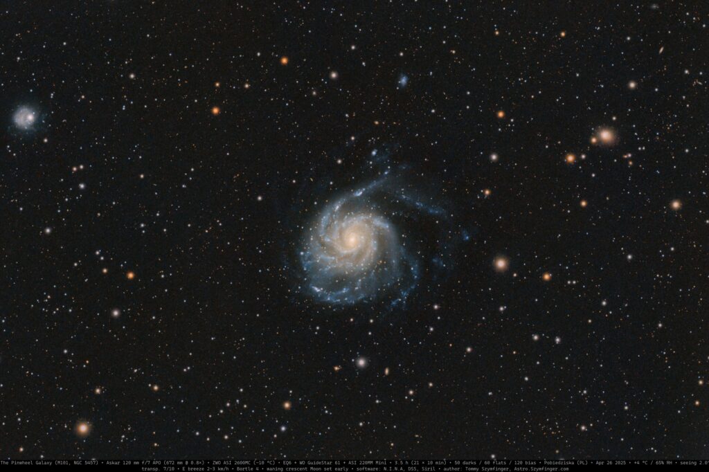 The Pinwheel Galaxy (Messier 101, NGC 5457) is a spectacular face-on spiral galaxy in the constellation Ursa Major, located about 21 ± 0.8 million light-years from Earth. With a vast diameter of around 170,000 light-years, it is almost twice as large as the Milky Way, making it one of the largest disk galaxies in our cosmic neighborhood. For astrophotographers, M101 is a combination of challenge and reward — its bright central region is easy to capture, but the faint, sprawling arms test both equipment and processing skills.