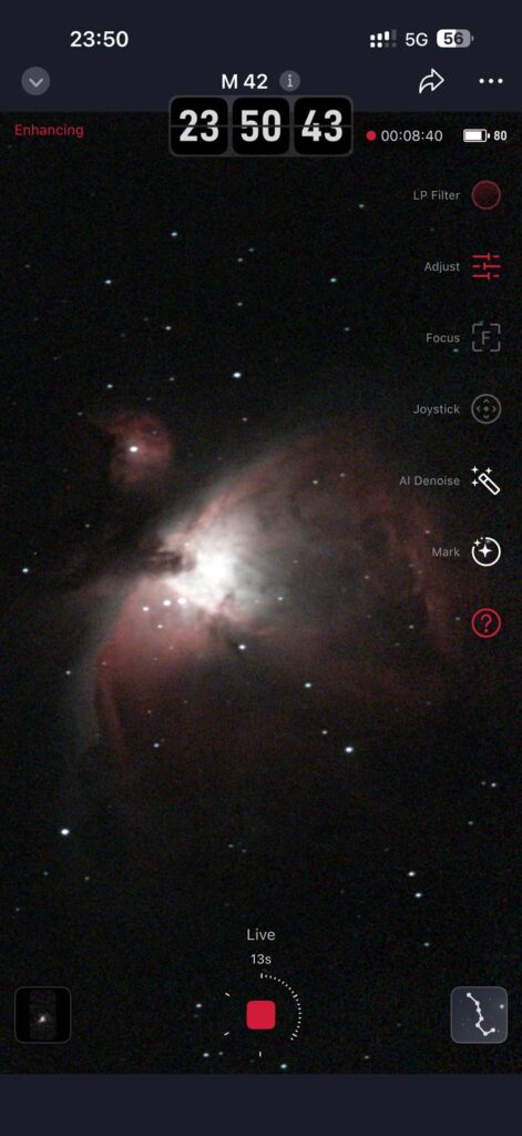 Within just a few minutes, the Orion Nebula was already clearly recognizable, well framed, and steadily improving in signal-to-noise ratio. The absence of noticeable drift or stacking artifacts demonstrates the effectiveness of the internal tracking system, even when operating on an alt-azimuth mount.